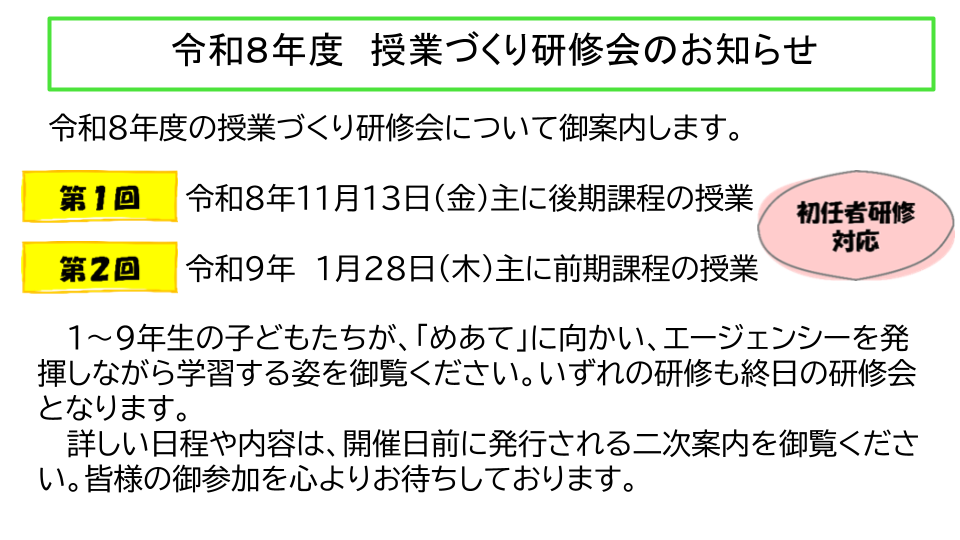 ~令和8年度 授業づくり研修会(初任者研修対象)~ 児童会・生徒会 PTA・教育後援会 学校運営協議会 同窓会 研究 HOME 令和8年度 授業づくり研修会(初任者研修対象) 令和8年度 授業づくり研修会についてお知らせします。 詳しくは こちら を参照ください。