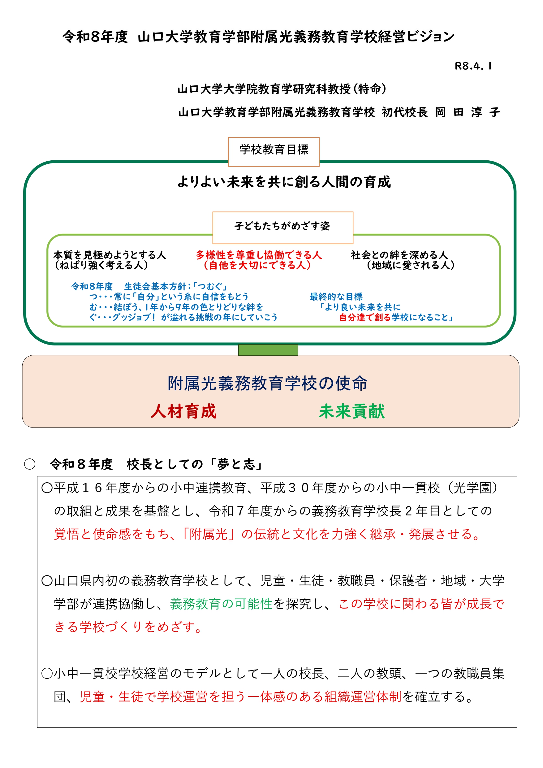 附属学校がこの地にある意味を背景として、本校の教育活動によろしくご理解ご支援を賜りますようお願い申し上げます。